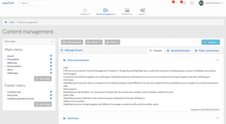 majesteel part du constat qu'un bon nombre de projets ont une part signaficative de développements métiers (ou sur mesure) et que les CMS du marché, bien qu'évoluant dans le bon sens, ne permettent pas de remplir à 100% ces contraintes métiers. Nous avons recherché des CMF sous sf2, mais force est de reconnaître que pour le moment il n'existe aucun CMF à la fois ergonomique pour l'éditeur et simple à prendre en main pour les développeurs, majesteel répond à ces 2 problématiques, tout en gardant la force d'un framework comme symfony2 puisqu'il reste au coeur du projet.